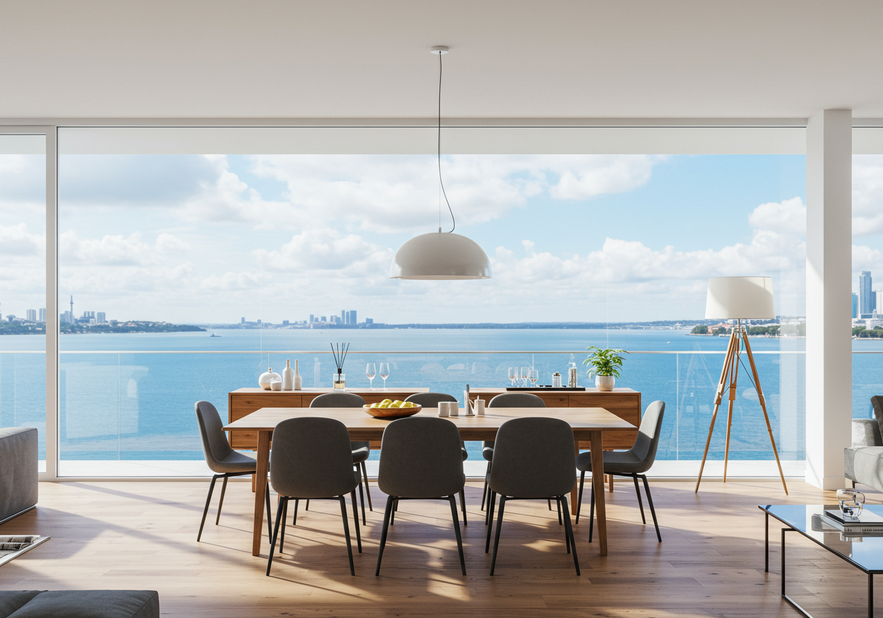 The floor-to-ceiling windows showcase panoramic sunrise views over the Bay.